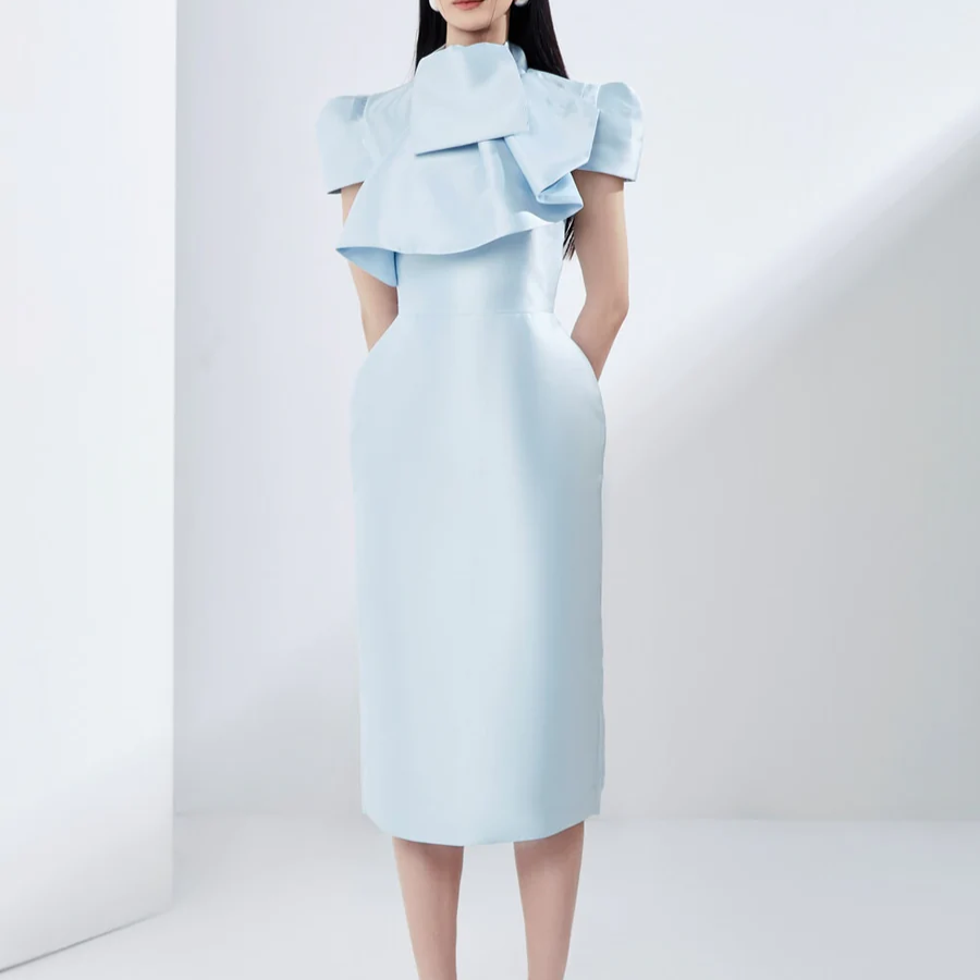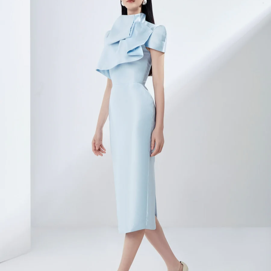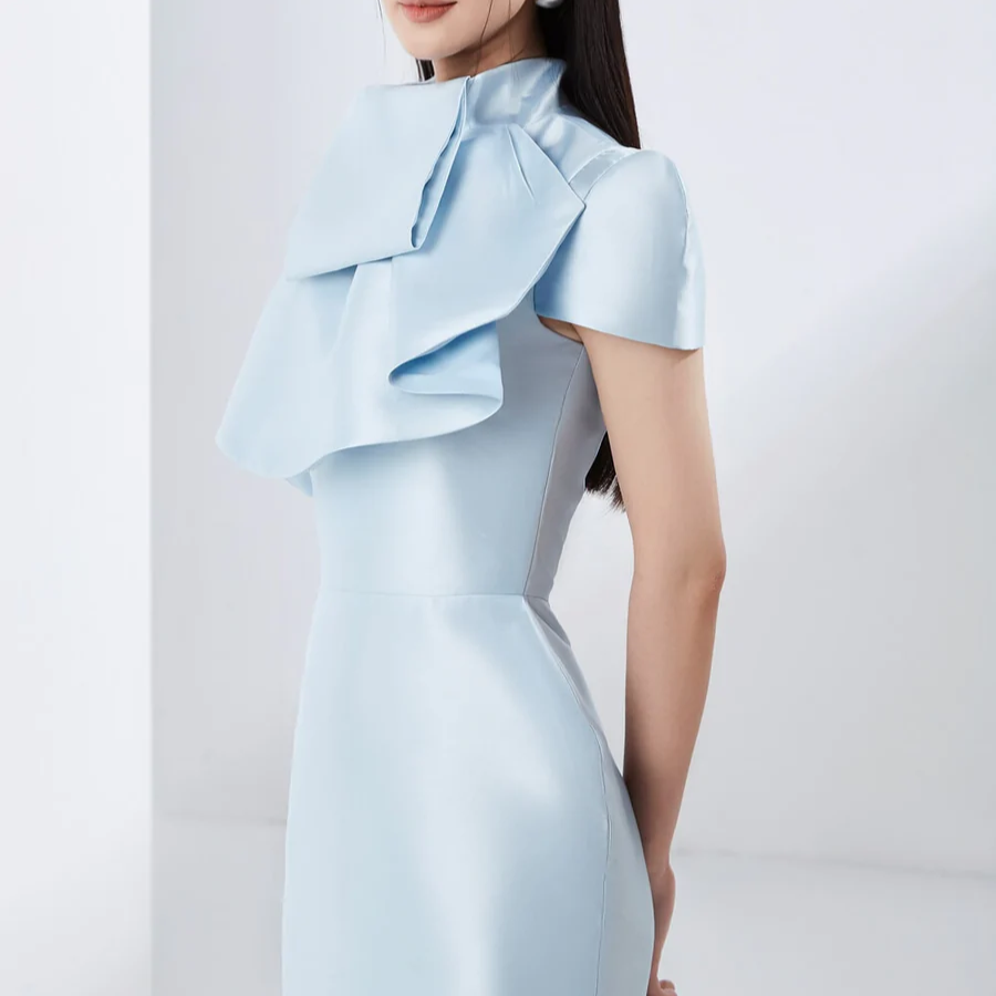 فستان تفته سماوي ضيق باكمام قصيرة مع طيات على الصدر