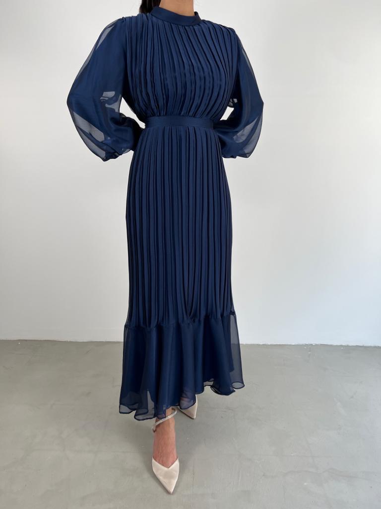 فستان كحلي غامق طويل بكسرات صغيرة و أكمام طويلة منفوخة