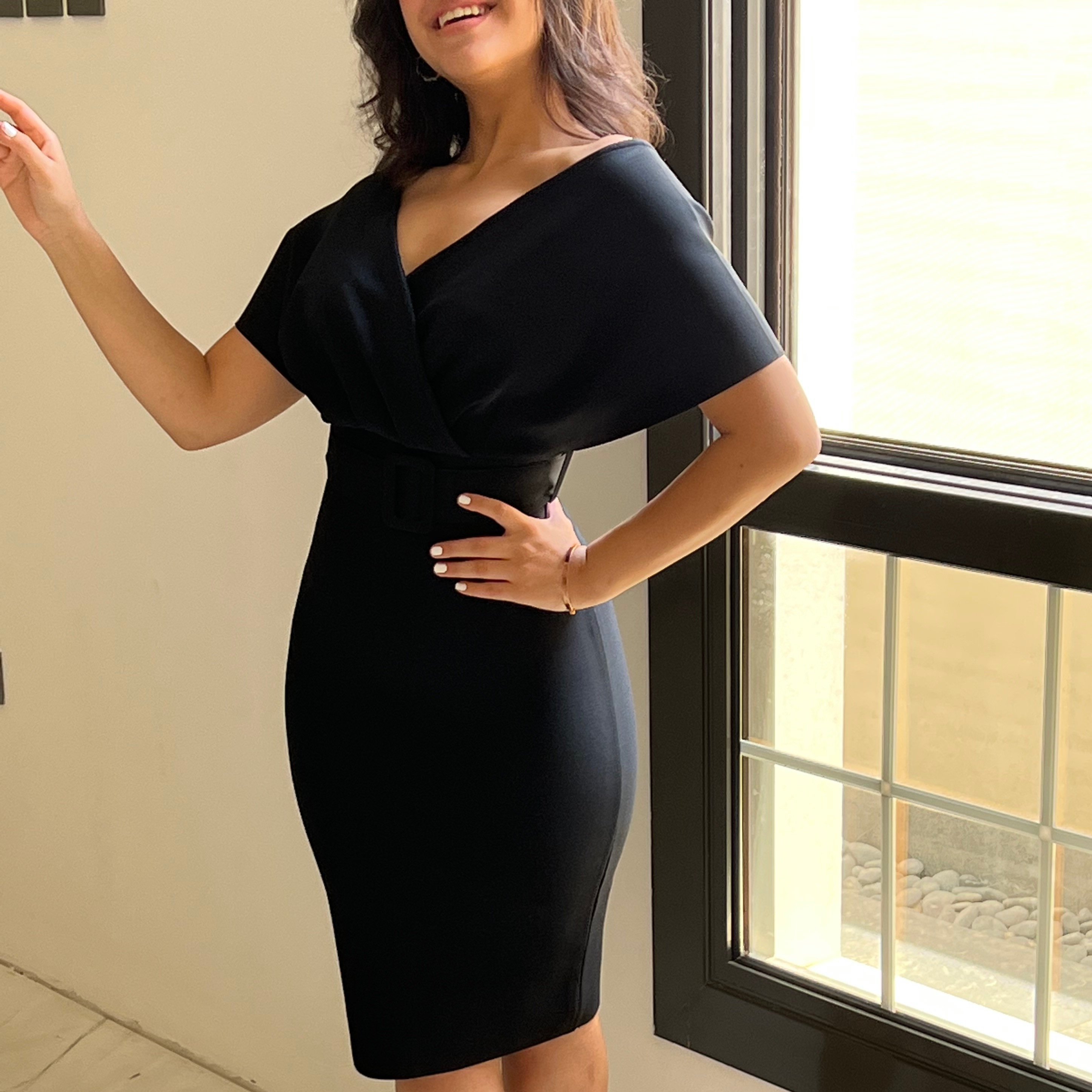 فستان قصير أسود بأكمام منسدلة وتنورة ضيقة