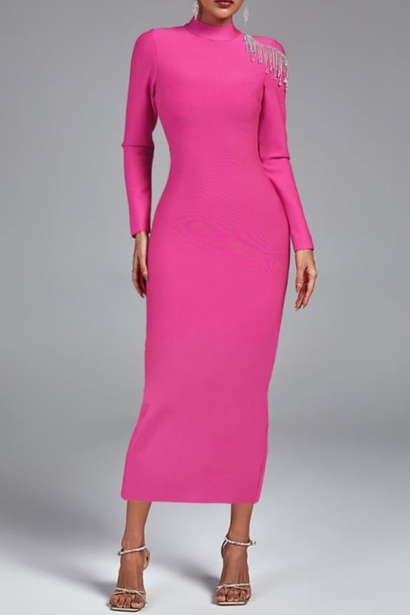 فستان فوشي باكمام طويلة وفتحة من الظهر مزينة بكرستالات